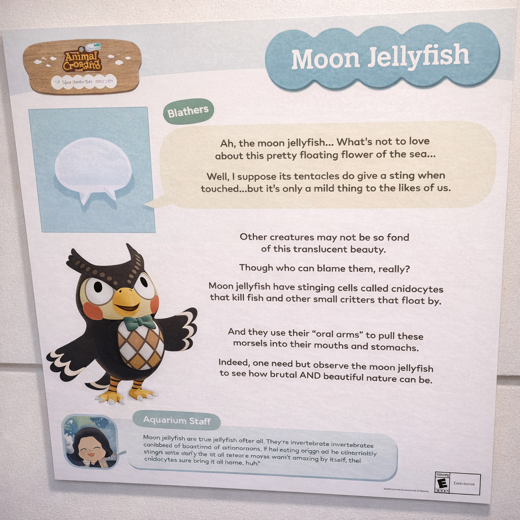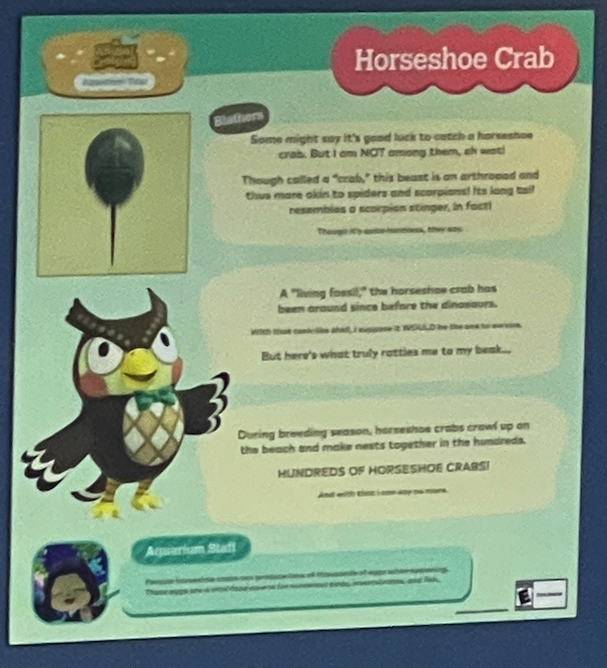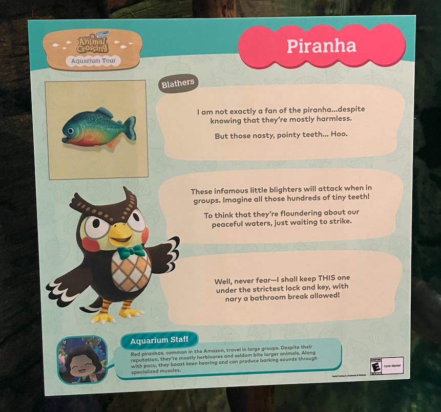 Unlike other museum and aquarium visits you may be used to, there really isn’t a separate “Animal Crossing Exhibit”. Rather, you’ll spend most of the day strolling through the aquarium’s normal exhibits. If you come across a fish or sea creature that you can catch while fishing or deep sea diving in New Horizons, there’ll be a special Animal Crossing-themed sign, in addition to whatever sign the aquarium normally has.
